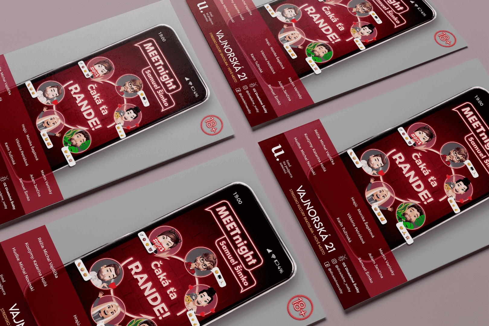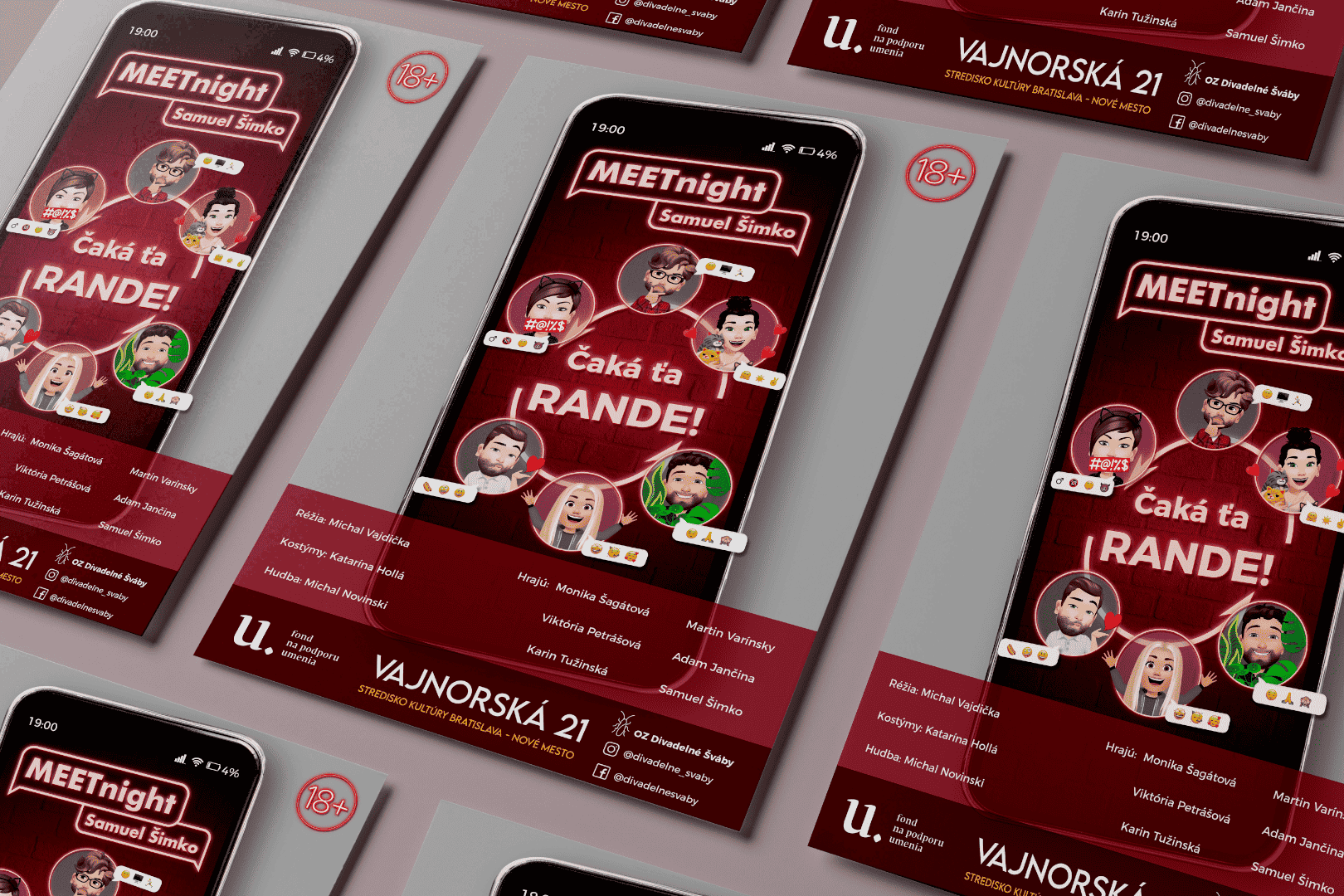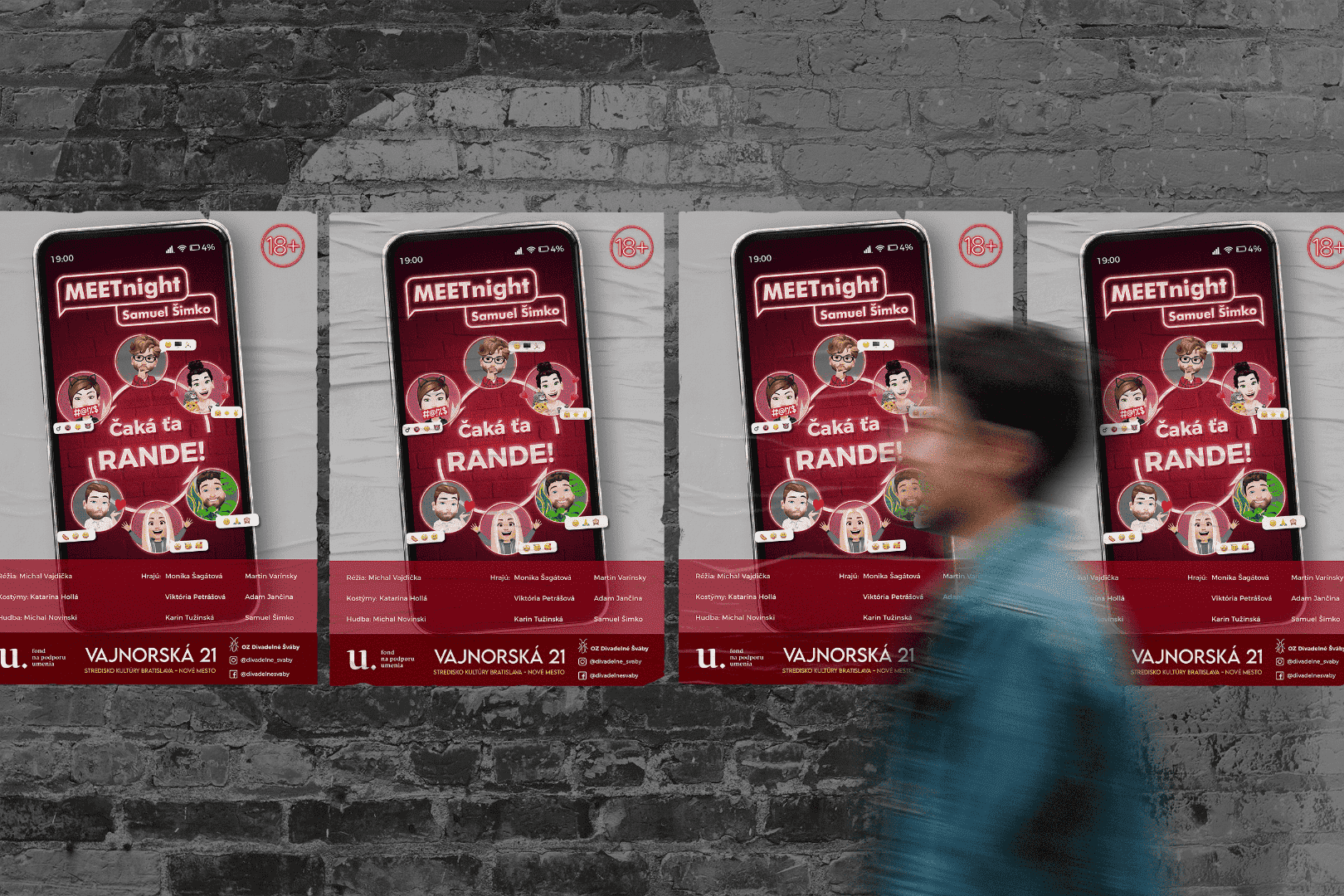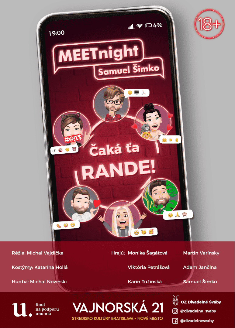 Tento plagát bol vytvorený pre čiernu komédiu “MEETNight”, ktorú režíruje Michal Vajdička. Hra sa sústredí na piatich ľudí, ktorí sa pokúsia zmeniť svoje životy cez zoznamku. Na plagáte sú zobrazené animované postavy, ktoré reprezentujú jednotlivých účastníkov tejto netradičnej zoznamky. Dizajn plagátu zaujme svojou modernou estetikou, ktorá využíva prvky digitálnej komunikácie a emoji, čo evokuje súčasnú kultúru online zoznamovania. Svetlé farby, neonový text a zábavný tón plagátu oslovujú divákov a dávajú tušiť, že predstavenie bude plné humoru a nečakaných situácií. Plagát zobrazuje čas a miesto konania predstavenia a jasne označuje, že je určené pre dospelých divákov.
