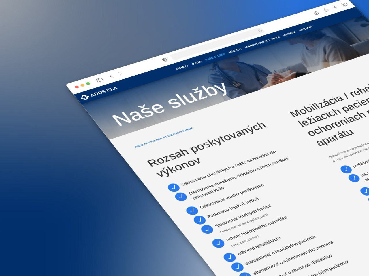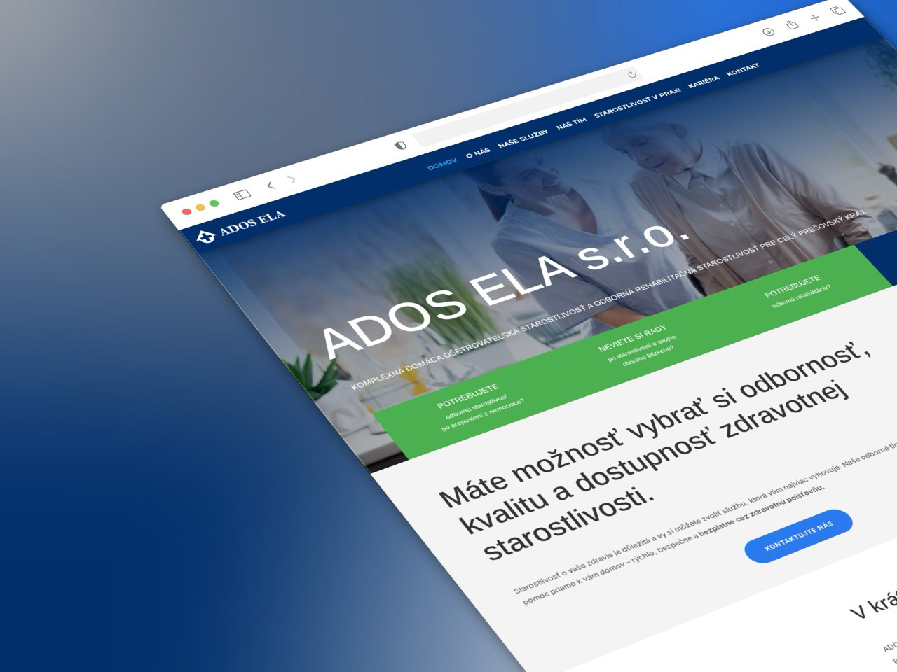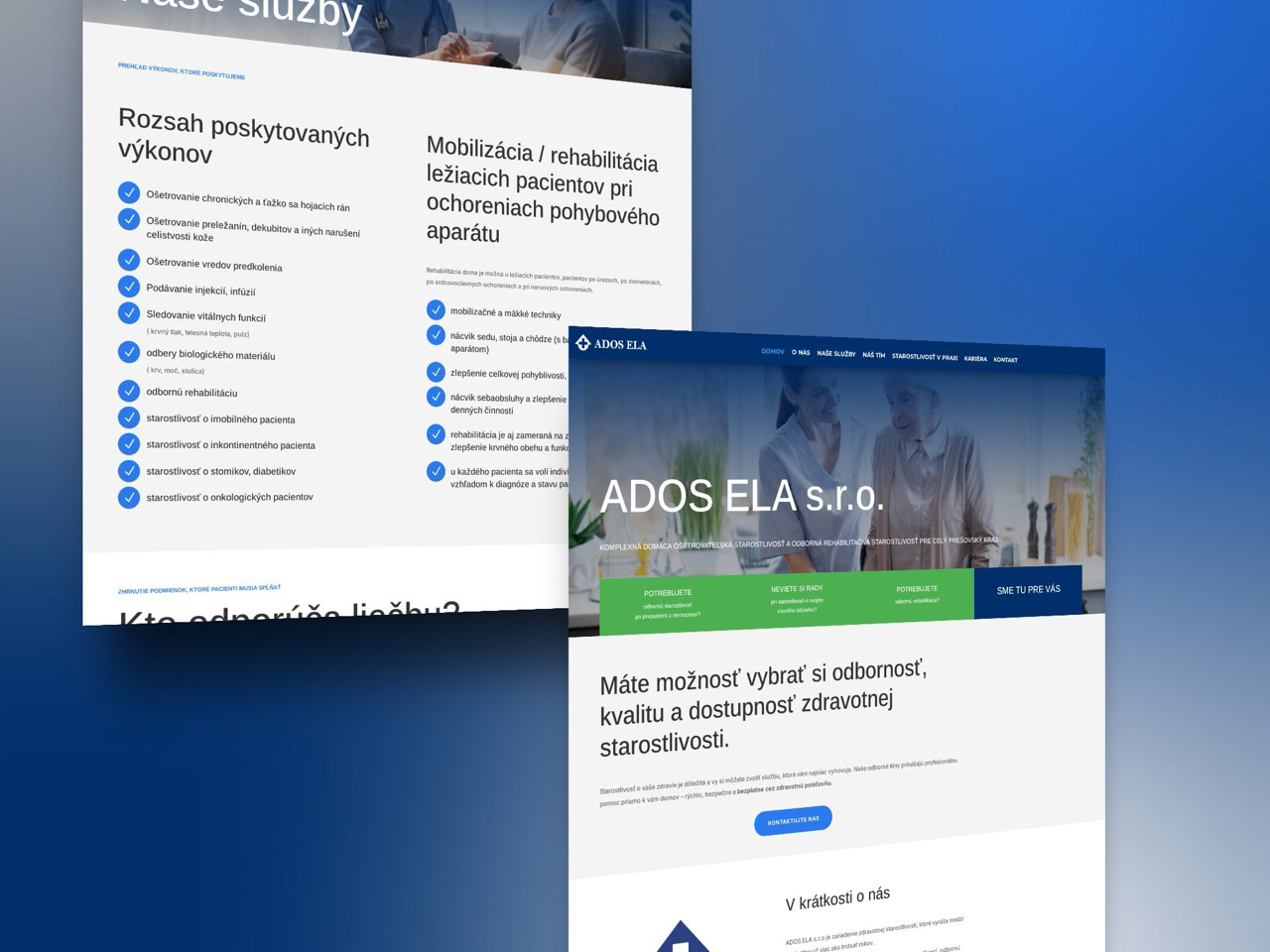 Tento web som navrhol a vytvoril pre spoločnosť ADOS ELA s.r.o., ktorá poskytuje komplexnú domácu ošetrovateľskú a odbornú rehabilitačnú starostlivosť v Prešovskom kraji.